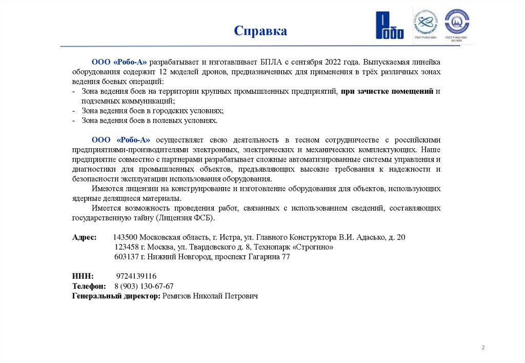 СправкаООО «Робо-А» разрабатывает и изготавливает БПЛА с сентября 2022 года. Выпускаемая линейка