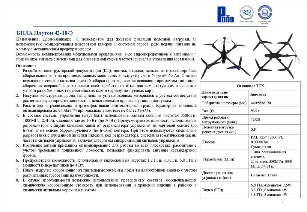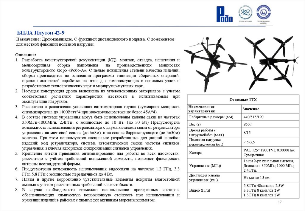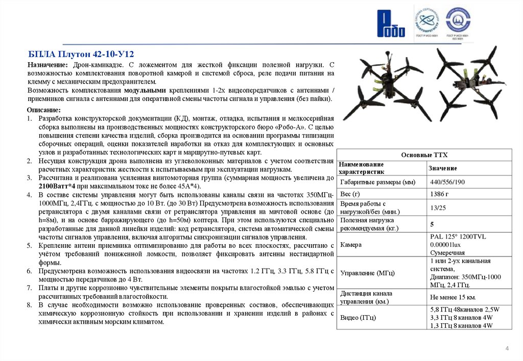 БПЛА Плутон 42-10-У12Назначение: Дрон-камикадзе. С ложементом для жесткой фиксации полезной нагрузки. С