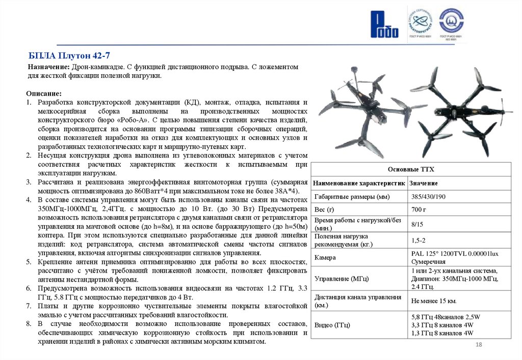 БПЛА Плутон 42-7Назначение: Дрон-камикадзе. С функцией дистанционного подрыва. С ложементом