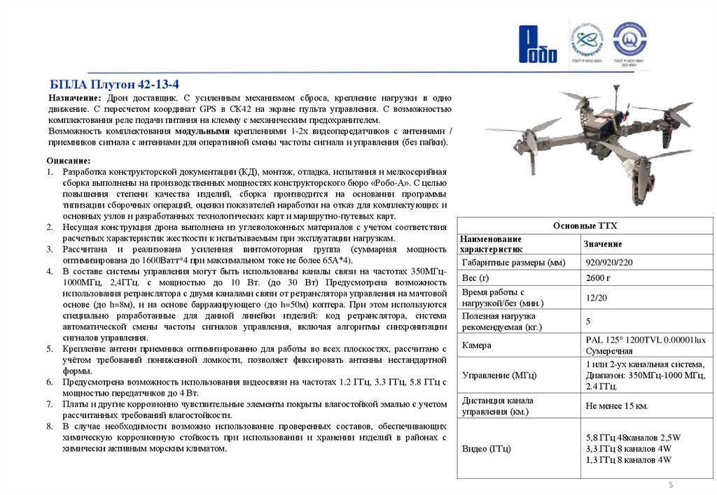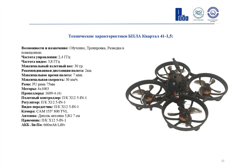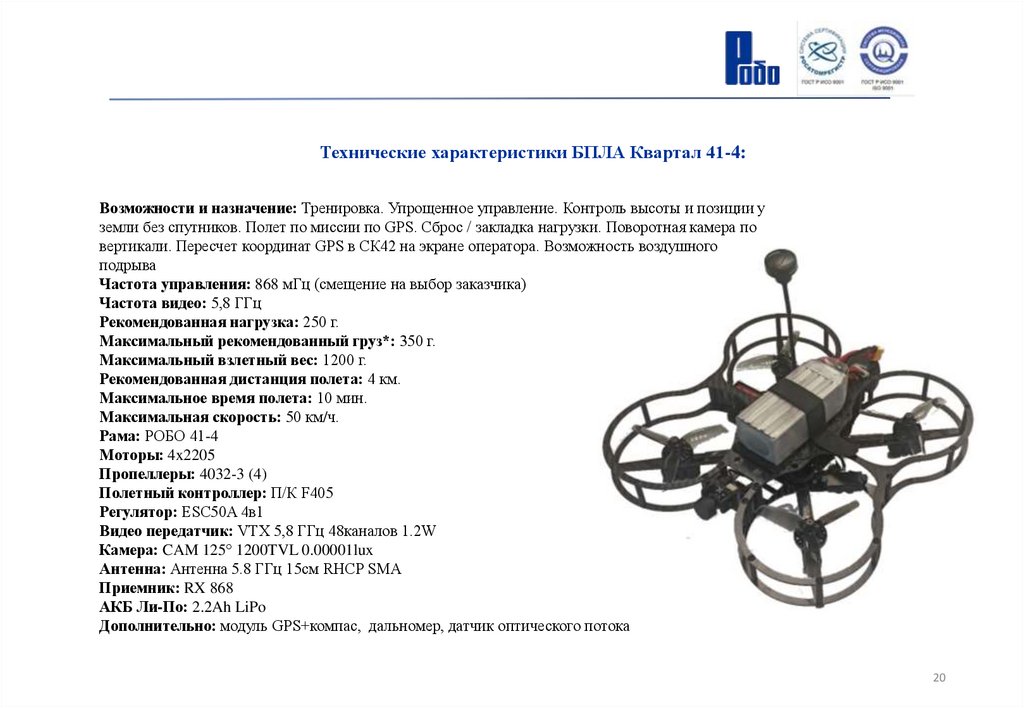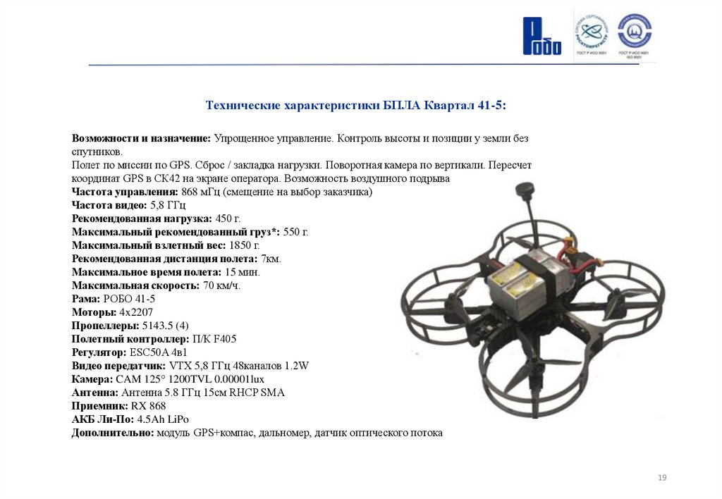 Технические характеристики БПЛА Квартал 41-5:Возможности и назначение: Упрощенное управление. Контроль высоты и позиции у земли без