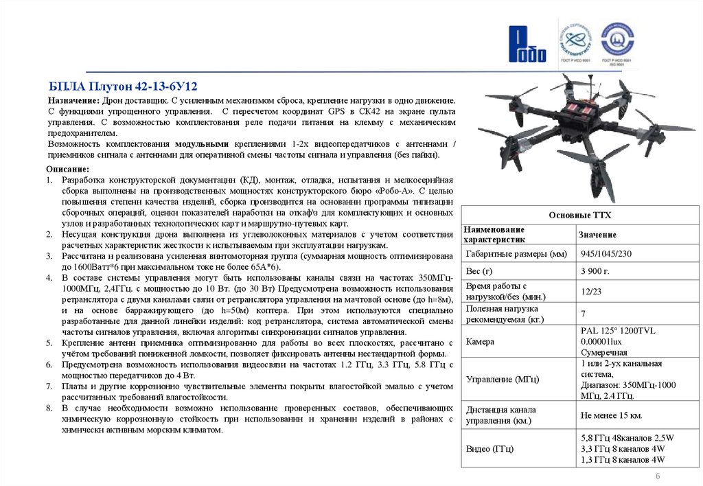 2. Несущая конструкция дрона выполнена из углеволоконных материалов с учетом соответствия Наименование