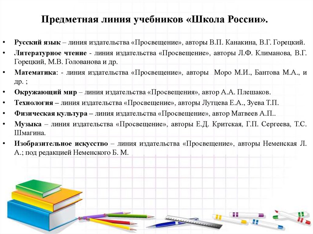 Предметная линия учебников «Школа России».Русский язык – линия издательства «Просвещение», авторы В.П. Канакина, В.Г. Горецкий.