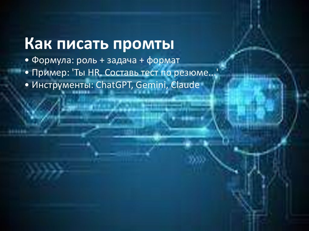 • Пример: 'Ты HR. Составь тест по резюме...'