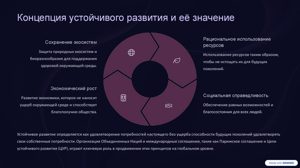 Устойчивое развитие определяется как удовлетворение потребностей настоящего без ущерба способности будущих поколений удовлетворять