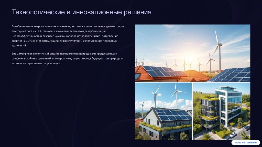 Технологические и инновационные решенияВозобновляемая энергия, такая как солнечная, ветровая и геотермальная, демонстрирует