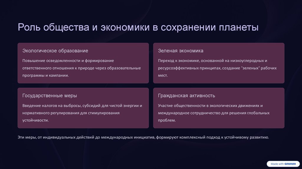 Эти меры, от индивидуальных действий до международных инициатив, формируют комплексный подход к устойчивому развитию.