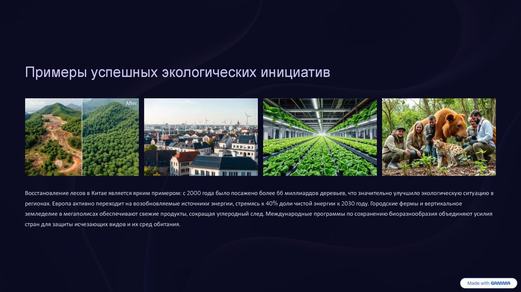 Примеры успешных экологических инициативВосстановление лесов в Китае является ярким примером: с 2000 года было посажено более 66 миллиардов деревьев, что значительно улучшило экологическую ситуацию в