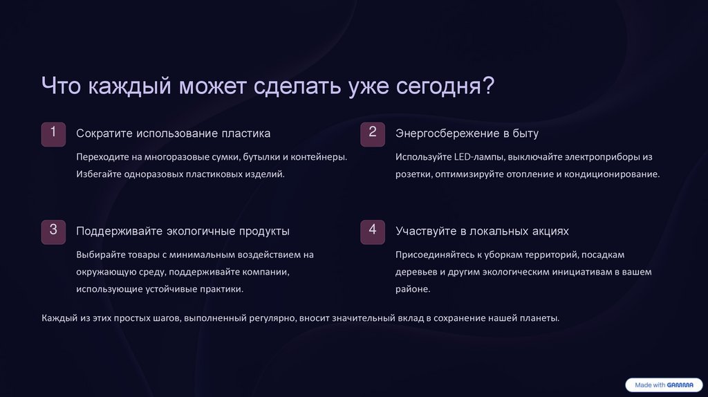 Каждый из этих простых шагов, выполненный регулярно, вносит значительный вклад в сохранение нашей планеты.