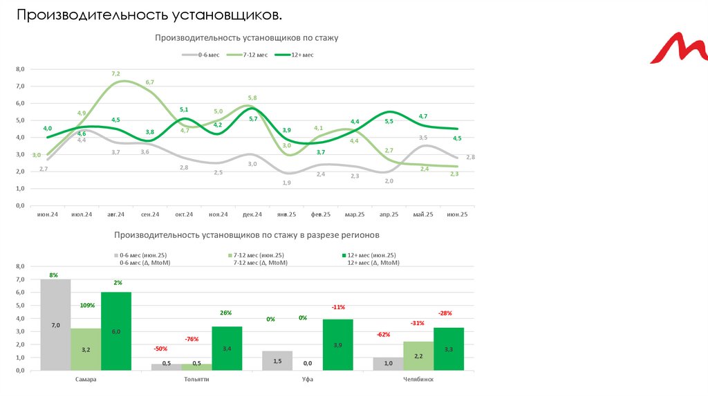 Производительность установщиков.Производительность установщиков по стажу