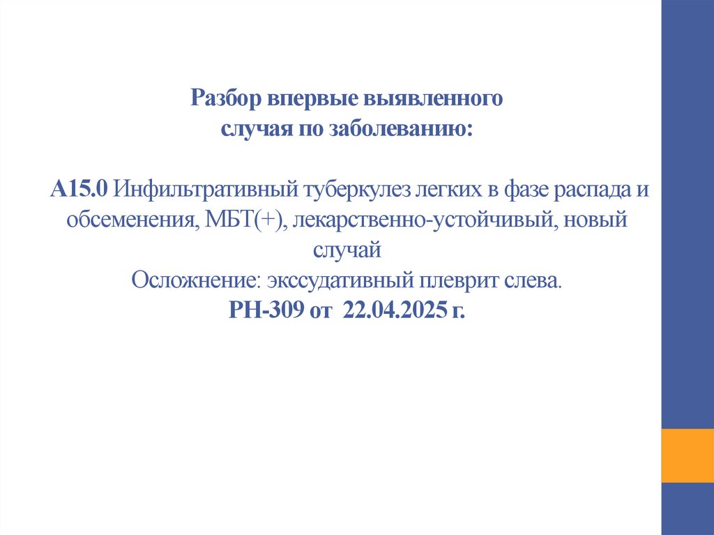 1. Разбор впервые выявленного случая по заболеванию: А15.0 Инфильтративный туберкулез легких в фазе распада и обсеменения, МБТ(+),