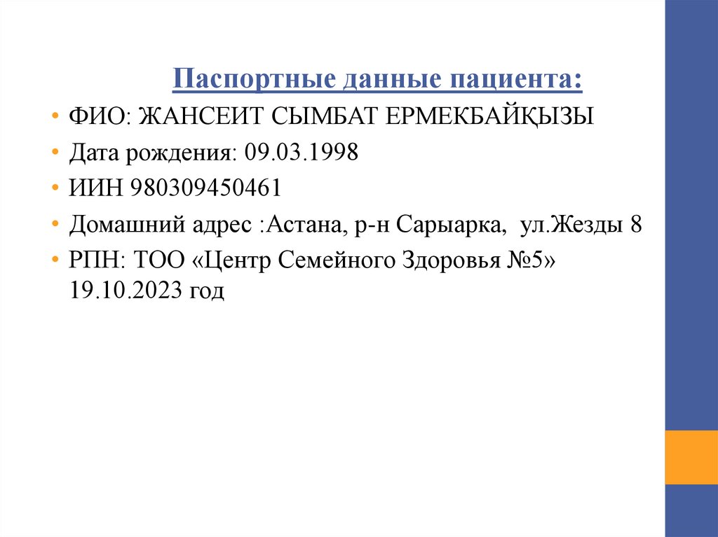 Паспортные данные пациента:• ФИО: ЖАНСЕИТ СЫМБАТ ЕРМЕКБАЙҚЫЗЫ