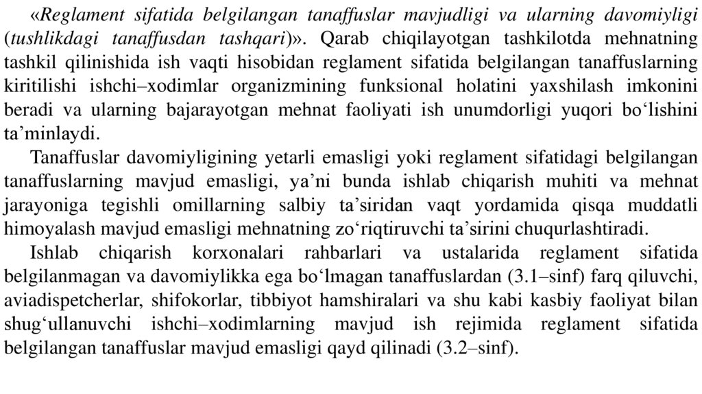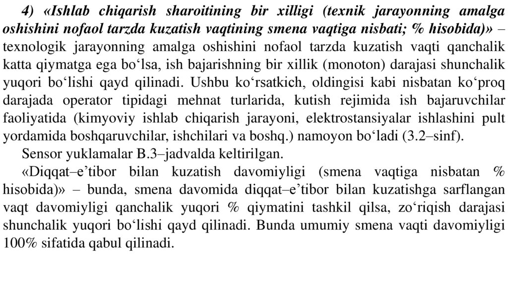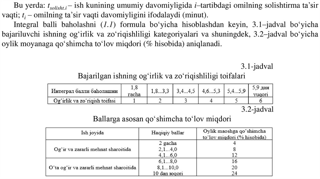 bajariluvchi ishning og‘irlik va zo‘riqishliligi kategoriyalari va shuningdek, 3.2–jadval bo‘yicha