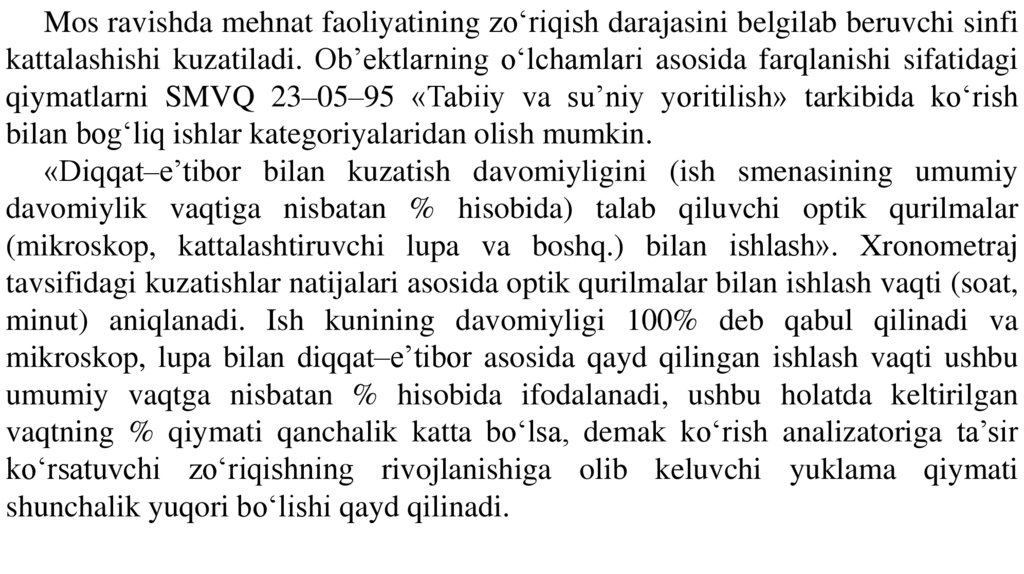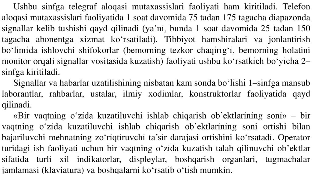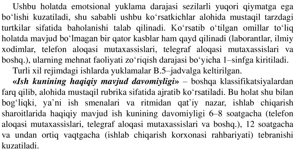 qilinuvchi mehnat faoliyati qarab chiqilsa, u holda zo‘riqish darajasi bo‘yicha ushbu