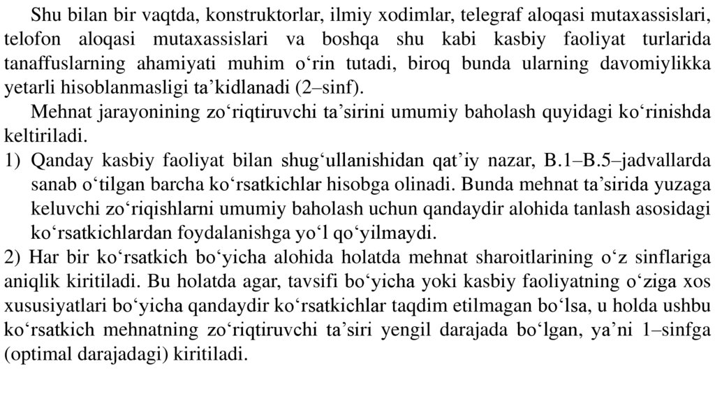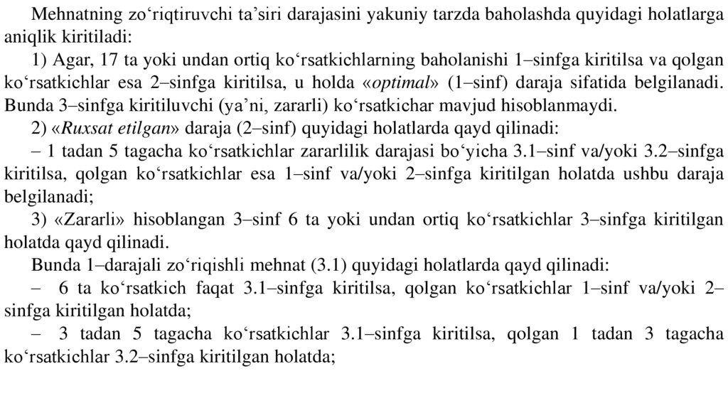 ko‘rsatkich mehnatning zo‘riqtiruvchi ta’siri yengil darajada bo‘lgan, ya’ni 1–sinfga