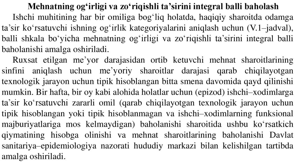 Mehnatning og‘irligi va zo‘riqishli ta’sirini integral balli baholashIshchi muhitining har bir omiliga bog‘liq holatda, haqiqiy sharoitda odamga