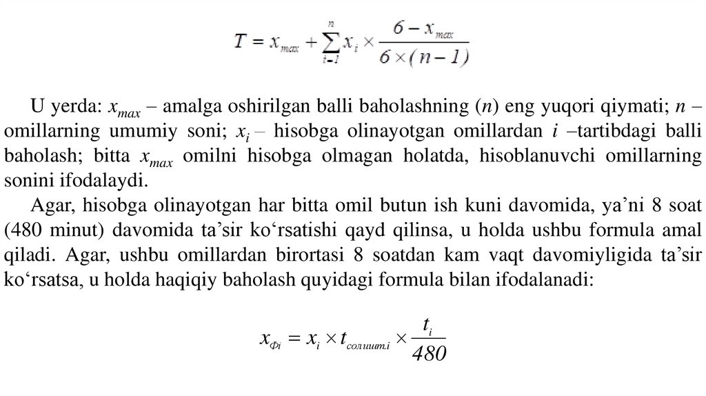 U yerda: xmax – amalga oshirilgan balli baholashning (n) eng yuqori qiymati; n –omillarning umumiy soni; xi – hisobga olinayotgan omillardan i –tartibdagi balli