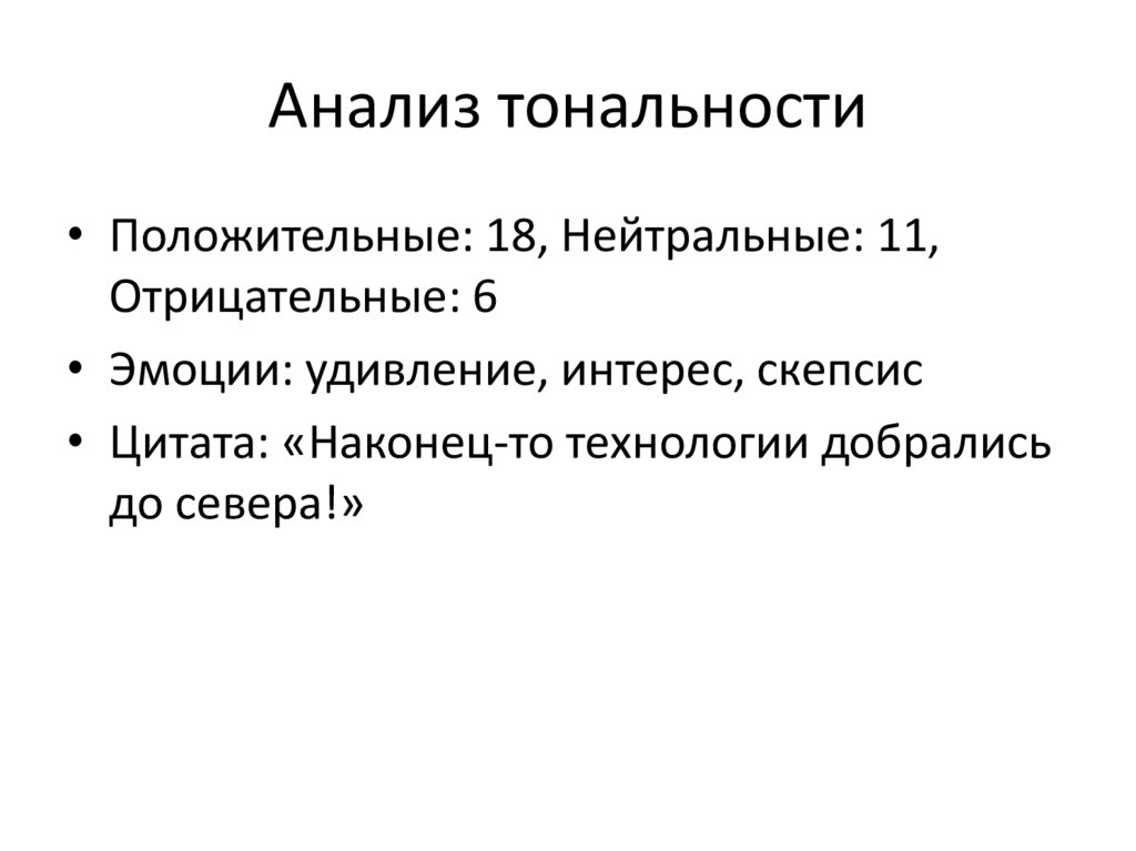 Анализ тональности• Положительные: 18, Нейтральные: 11,