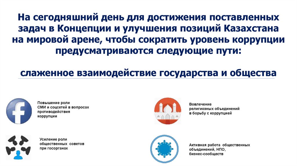 На сегодняшний день для достижения поставленныхзадач в Концепции и улучшения позиций Казахстана