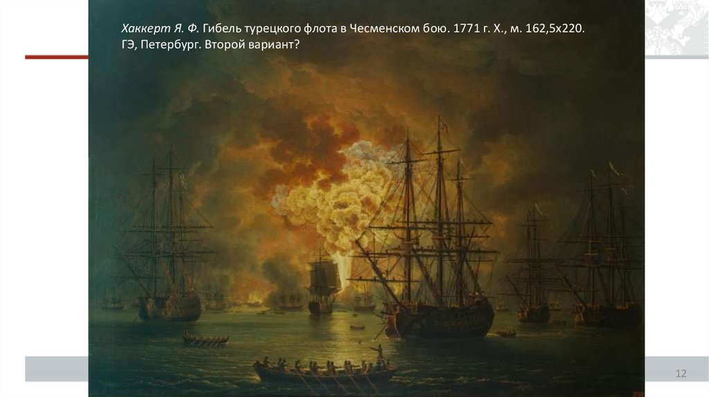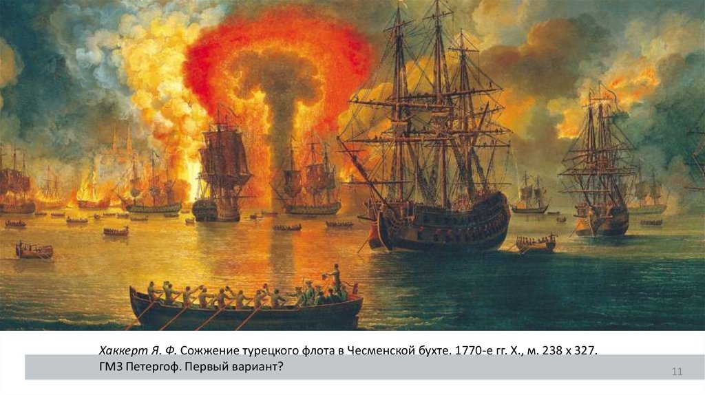 Хаккерт Я. Ф. Сожжение турецкого флота в Чесменской бухте. 1770-е гг. Х., м. 238 х 327.ГМЗ Петергоф. Первый вариант?