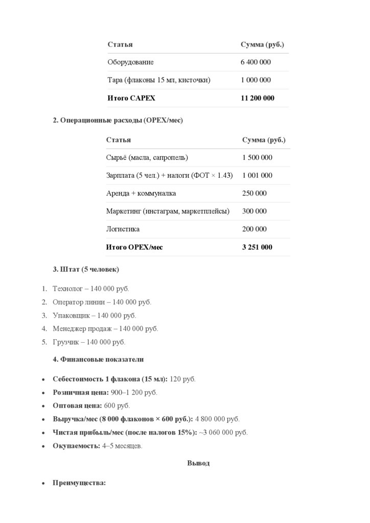 Выручка/мес (8 000 флаконов × 600 руб.): 4 800 000 руб.