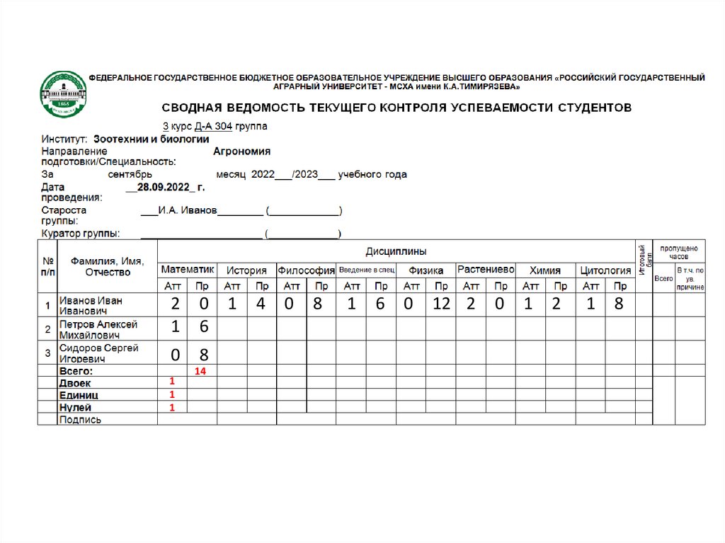 • Посчитать количество 2, 1 и 0 по дисциплине изаписать в соответствующие графы внизу