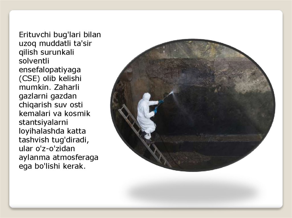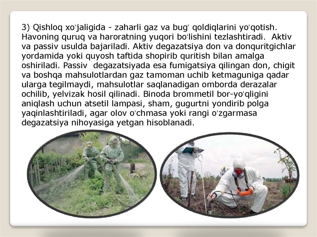 degazatsiya qilinadi. Xonalarni zaharli moddalar bugʻi va