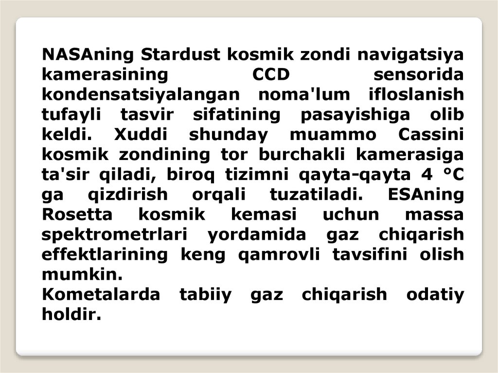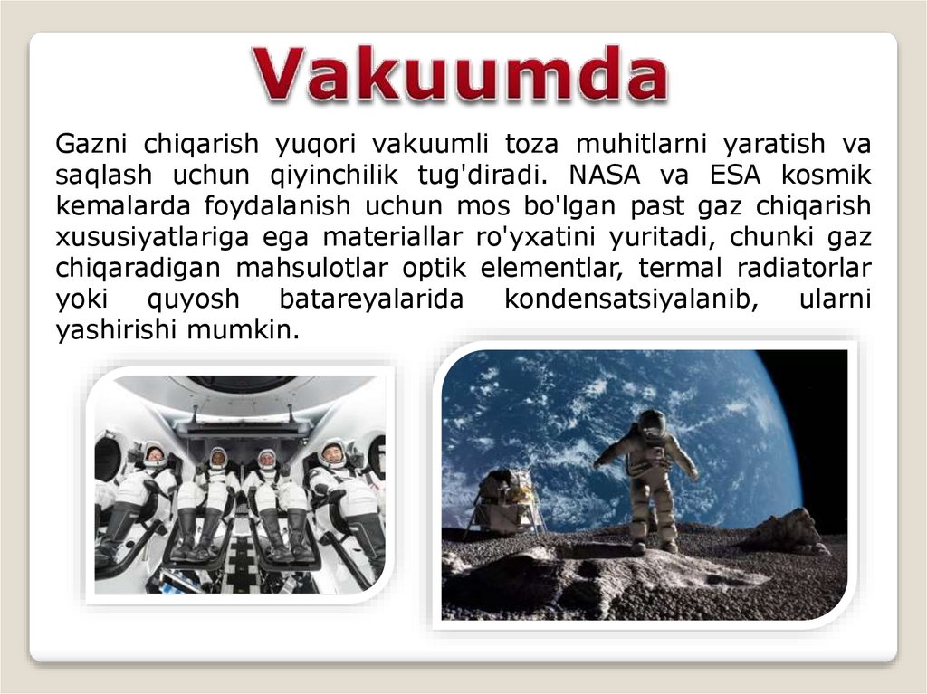 Gazni chiqarish yuqori vakuumli toza muhitlarni yaratish vasaqlash uchun qiyinchilik tug'diradi. NASA va ESA kosmik
