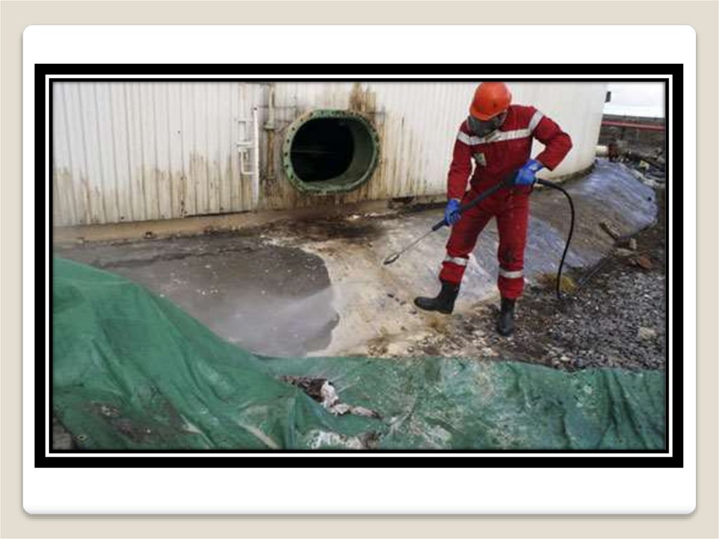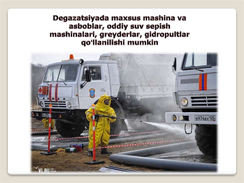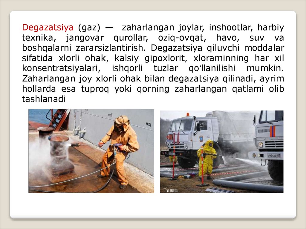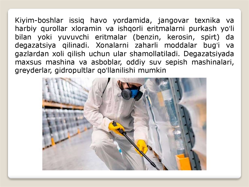 Kiyim-boshlar issiq havo yordamida, jangovar texnika vaharbiy qurollar xloramin va ishqorli eritmalarni purkash yoʻli