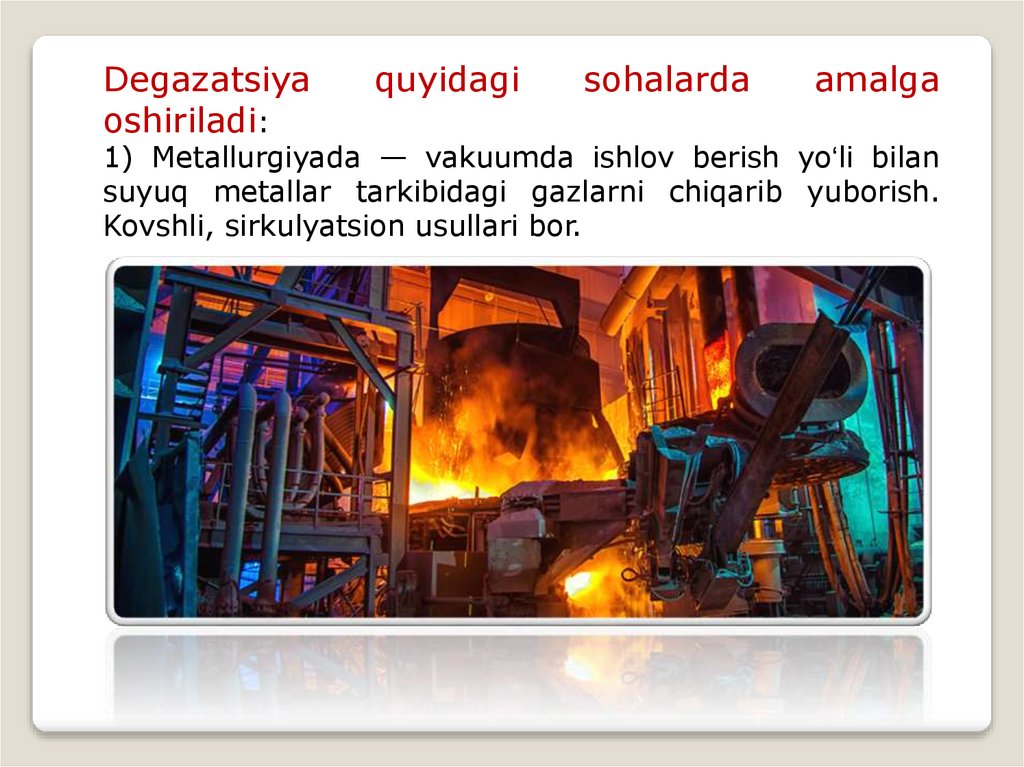 1) Metallurgiyada — vakuumda ishlov berish yoʻli bilan