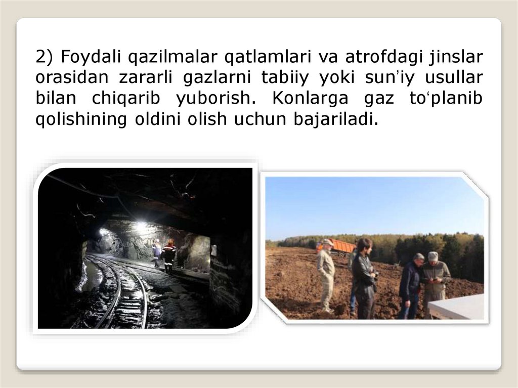 2) Foydali qazilmalar qatlamlari va atrofdagi jinslarorasidan zararli gazlarni tabiiy yoki sunʼiy usullar