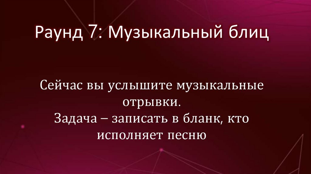 Раунд 7: Музыкальный блицСейчас вы услышите музыкальные