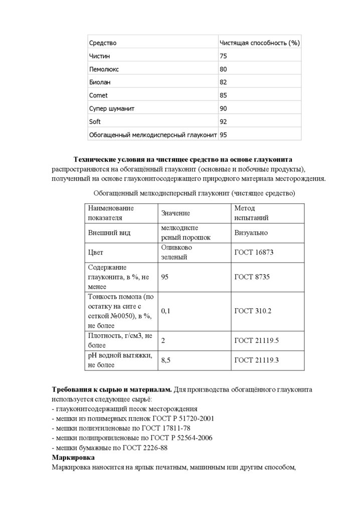 Требования к сырью и материалам. Для производства обогащённого глауконита