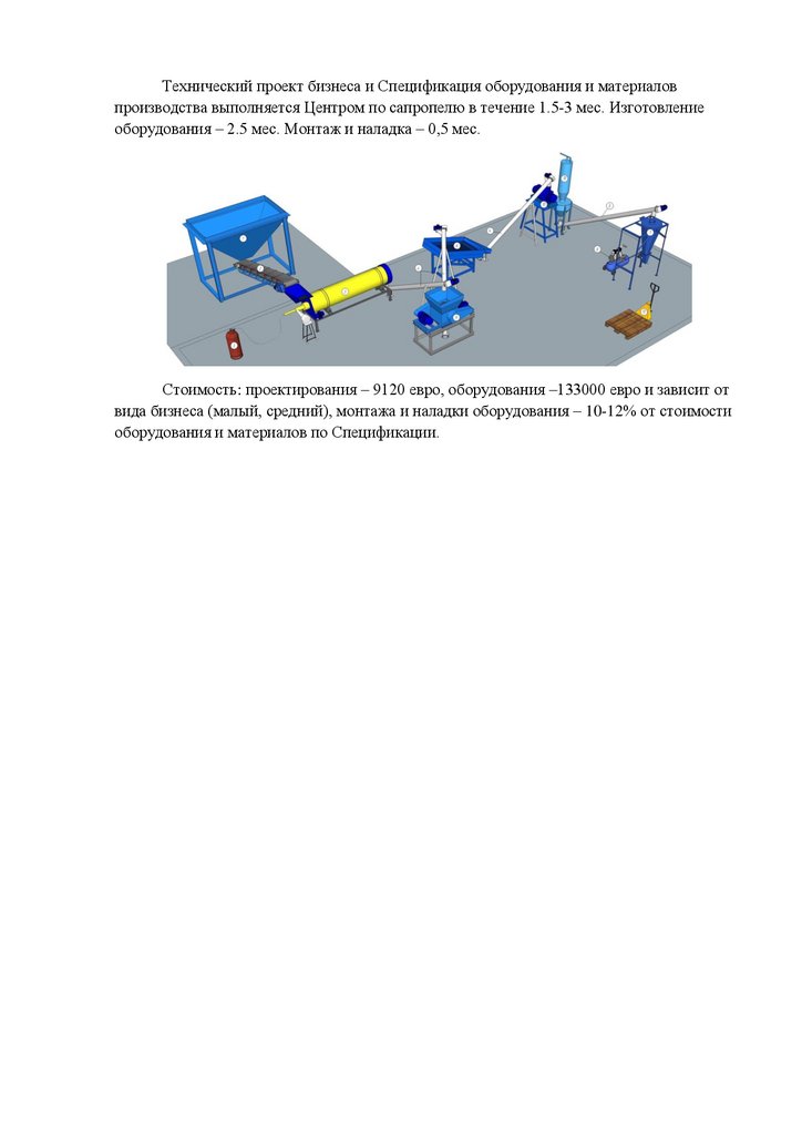 Технический проект бизнеса и Спецификация оборудования и материаловпроизводства выполняется Центром по сапропелю в течение 1.5-3 мес. Изготовление