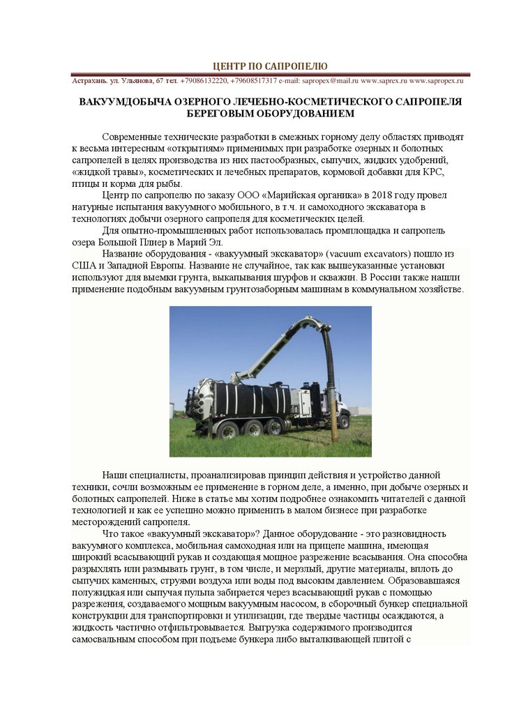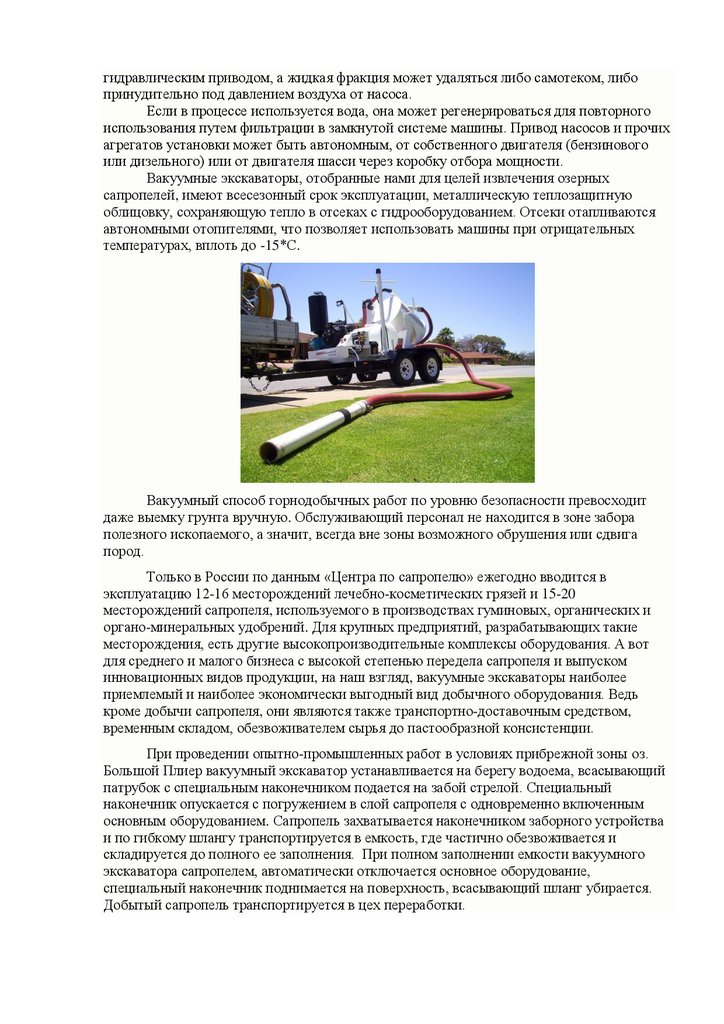 Как пример вакуумного экскаватора, используемого при добыче сапропеля ,