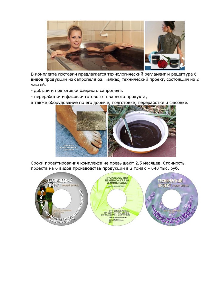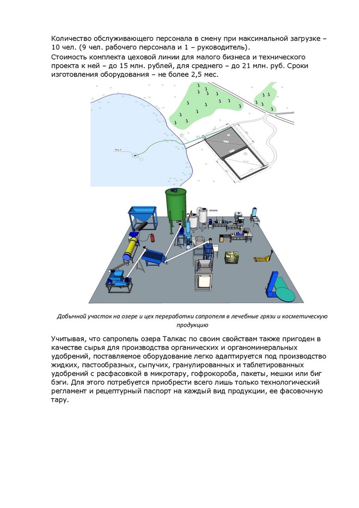 В комплекте поставки предлагается технологический регламент и рецептура 6видов продукции из сапропеля оз. Талкас, технический проект, состоящий из 2