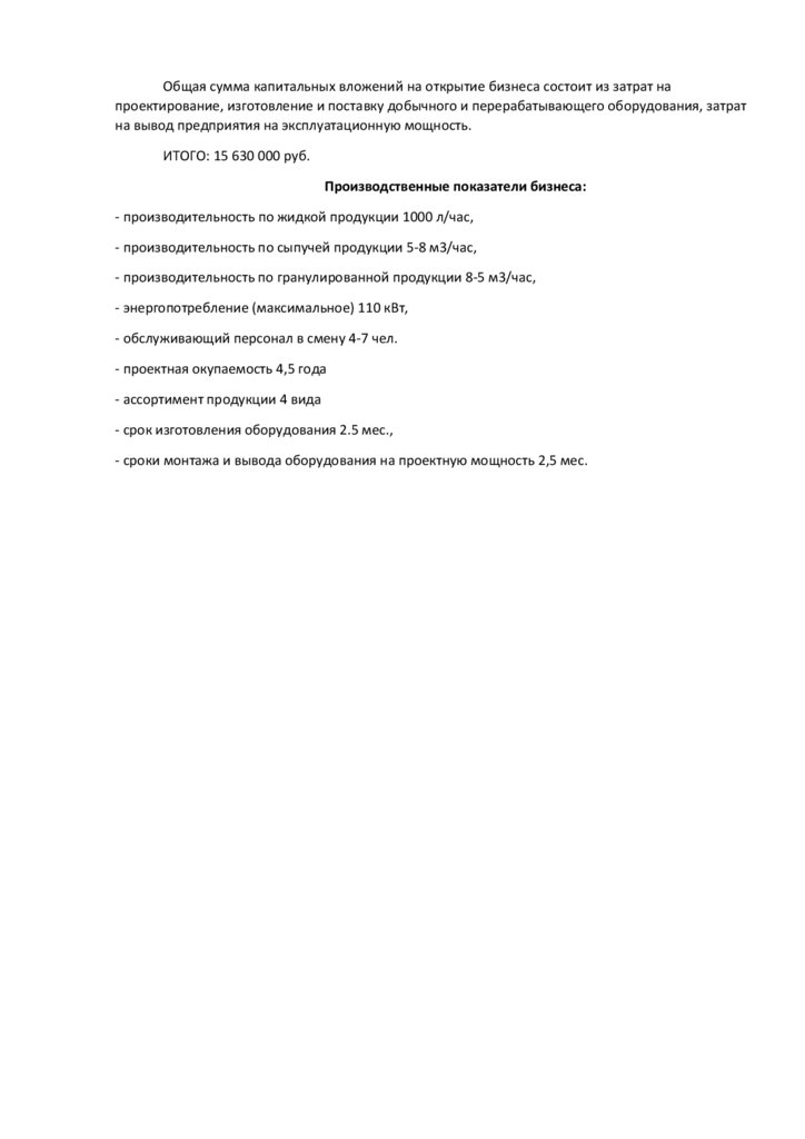 Общая сумма капитальных вложений на открытие бизнеса состоит из затрат напроектирование, изготовление и поставку добычного и перерабатывающего оборудования, затрат