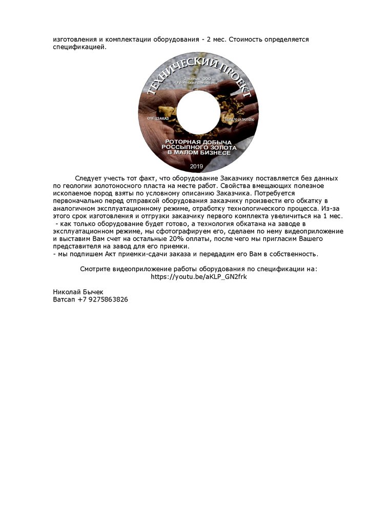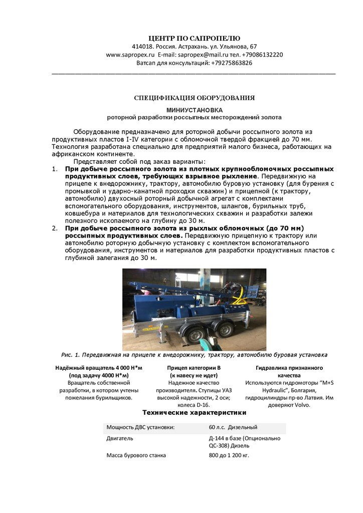 Спецификация миниоборудования роторной добычи золота с крупнообломочной фракцией