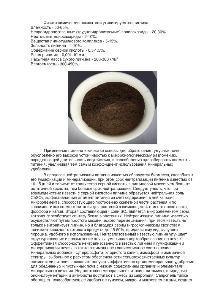 Физико-химические показатели утилизируемого лигнина:Влажность - 50-65%.