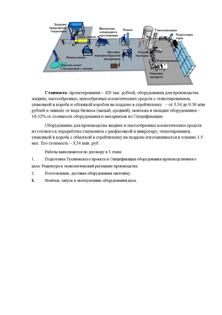 Стоимость: проектирования – 420 тыс. рублей, оборудования для производстважидких, пастообразных, мукообразных косметических средств с этикетированием,