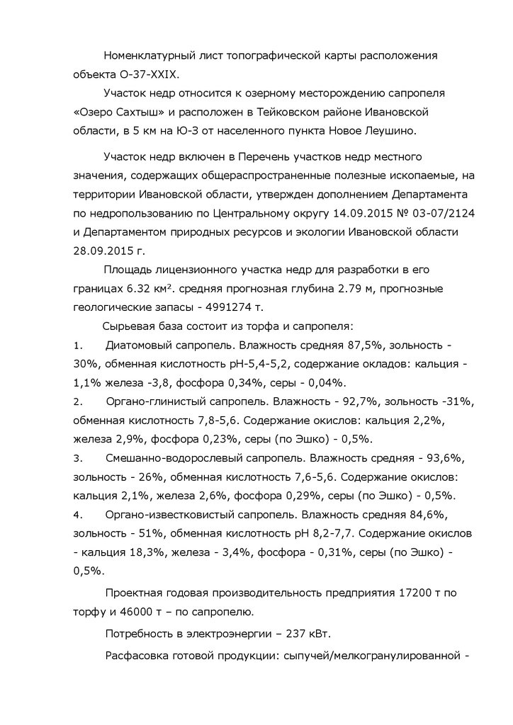 Содержание проекта Добыча и переработка сапропеля и торфа оз. Сахтыш - предварительный