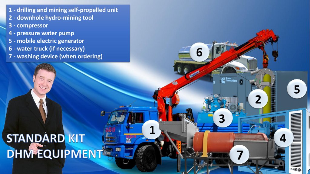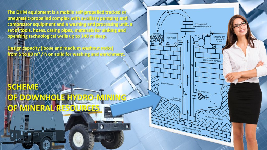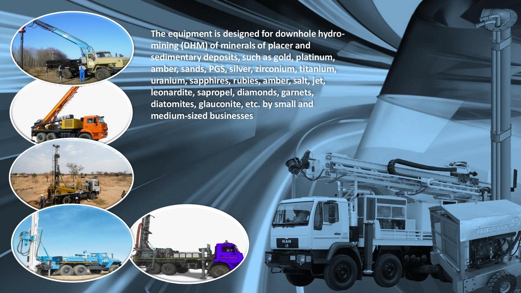 The DHM equipment is a mobile self-propelled tracked orpneumatic-propelled complex with auxiliary pumping and