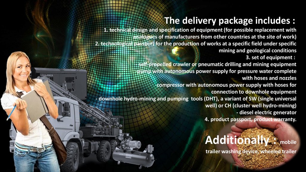 The delivery package includes :1. technical design and specification of equipment (for possible replacement with