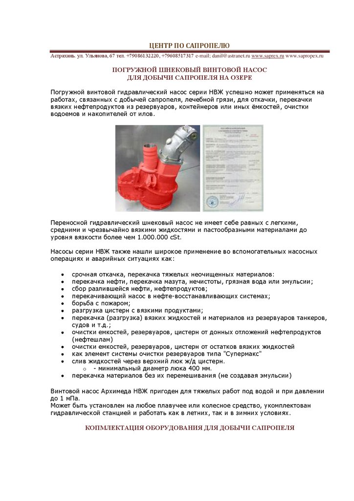 работах, связанных с добычей сапропеля, лечебной грязи, для откачки, перекачки