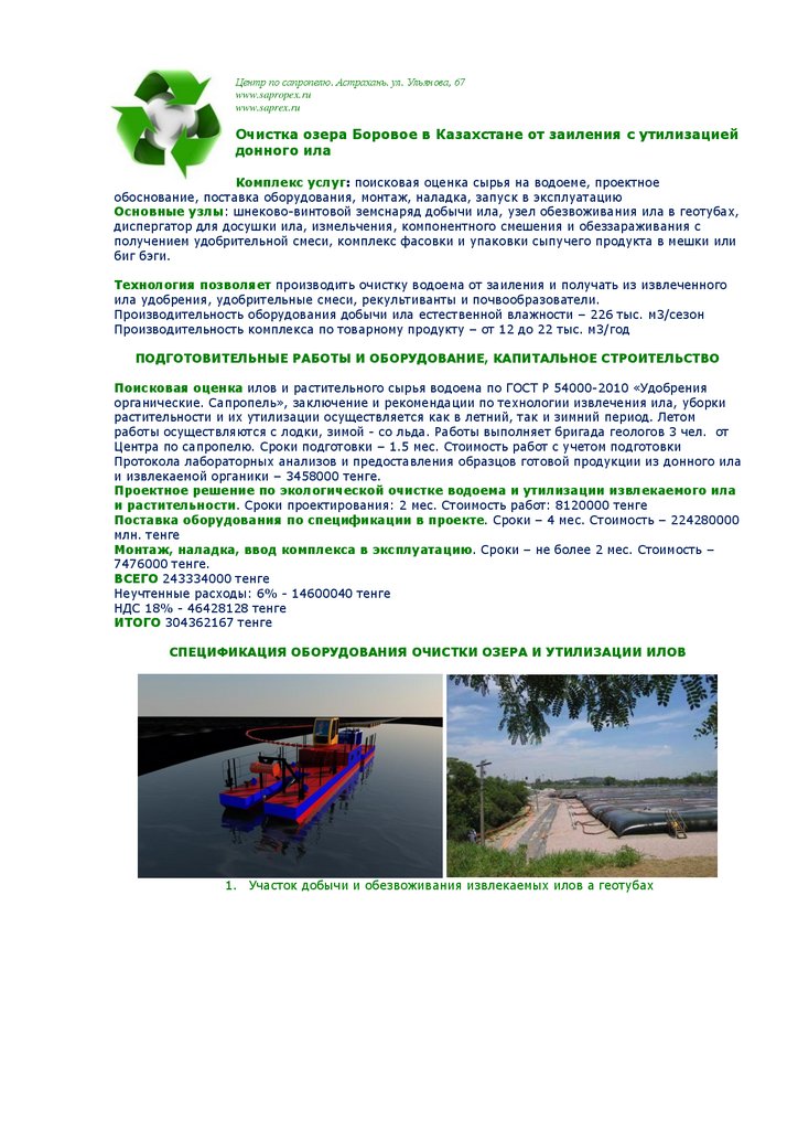 Центра по сапропелю. Сроки подготовки – 1.5 мес. Стоимость работ с учетом подготовки