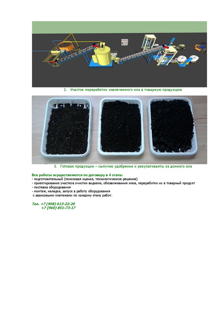 2. Участок переработки извлеченного ила в товарную продукцию3. Готовая продукция – сыпучие удобрения и рекультиванты из донного ила