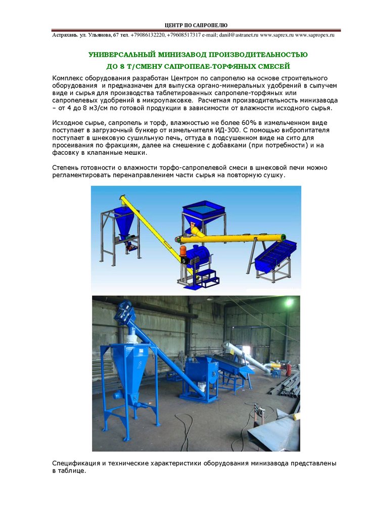 сапропелевых удобрений в микроупаковке. Расчетная производительность минизавода