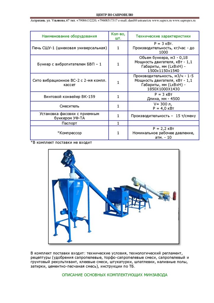 Спецификация и технические характеристики оборудования минизавода представлены
