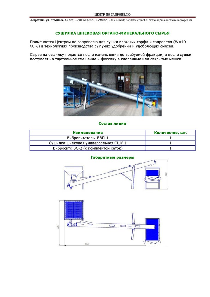 Применяется Центром по сапропелю для сушки влажных торфа и сапропеля (W=4060%) в технологиях производства сыпучих удобрений и удобряющих смесей.