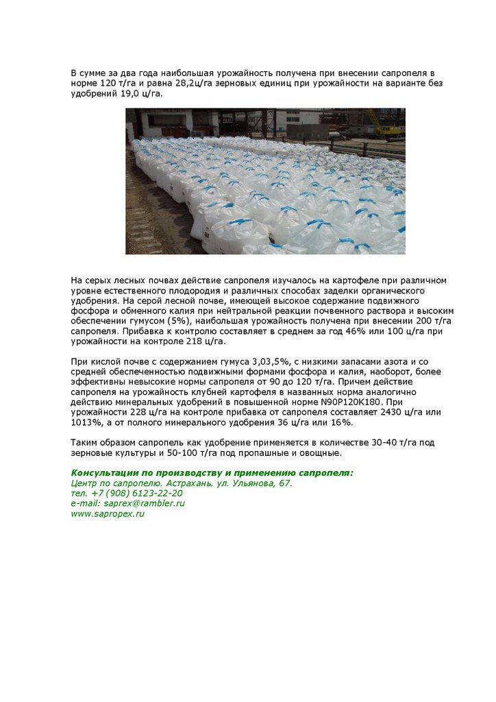 сапропелевого удобрения улучшая структуру почвы, благотворно действует на водновоздушный режим.