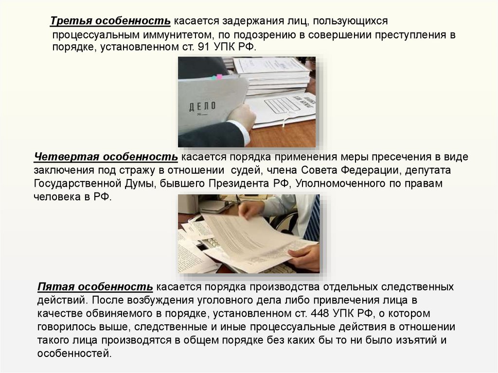 Третья особенность касается задержания лиц, пользующихсяпроцессуальным иммунитетом, по подозрению в совершении преступления в